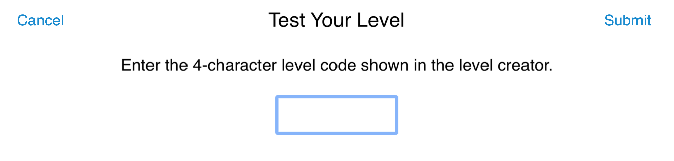 - to get a 4-character code. Use this code to edit your level later and to test on your device.